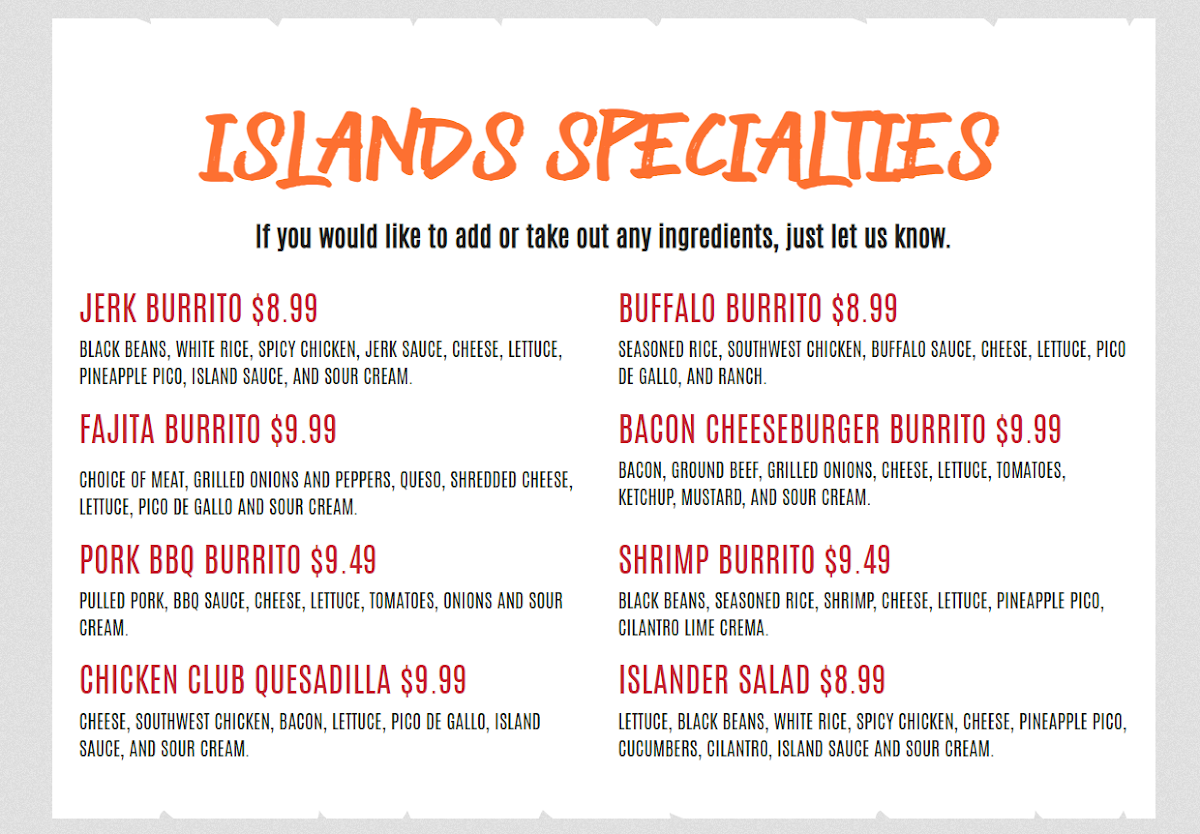 Black beans, white rice, jerk chicken, jerk sauce, cheese, pineapple salsa, lettuce, sour cream and Island sauce.