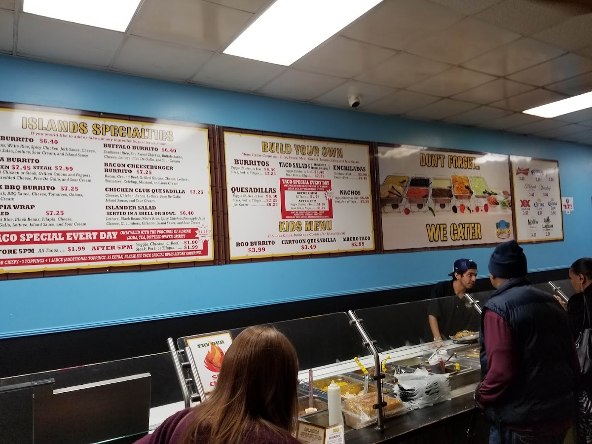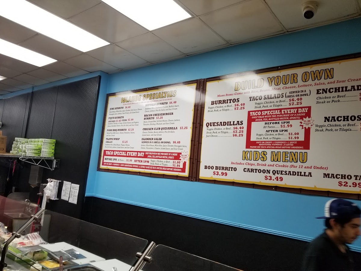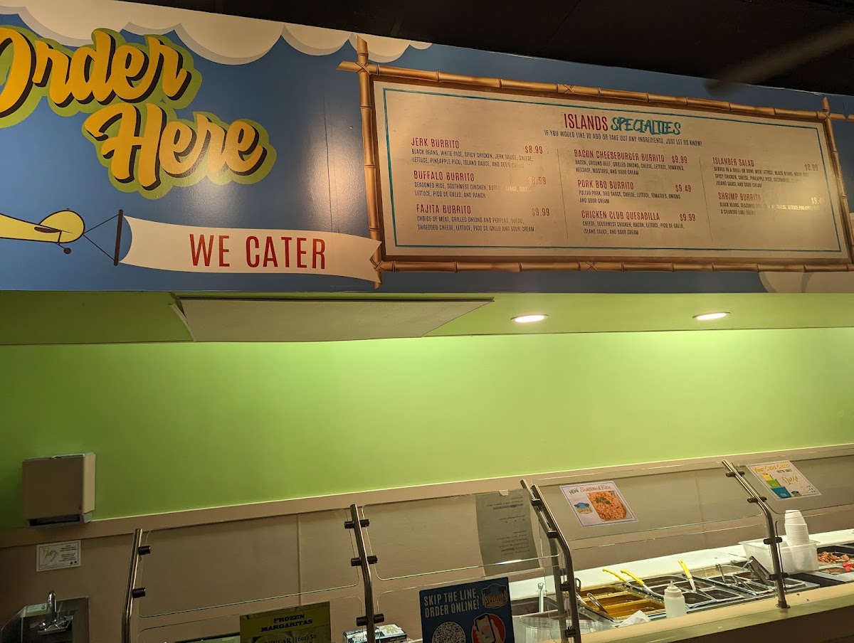 Served in a shell or bowl. lettuce, black beans, white rice, jerk chicken, pineapple salsa, cheese, cucumbers, cilantro, island sauce and sour cream