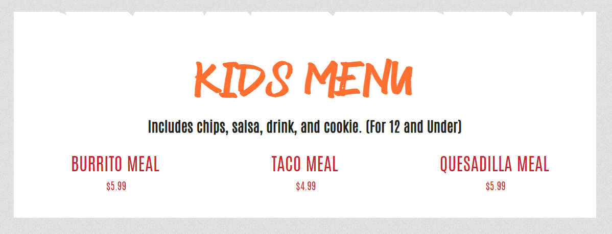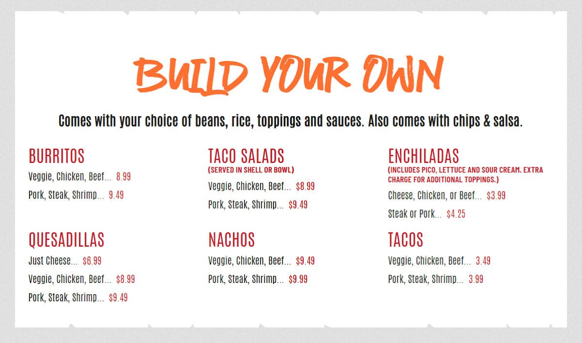 Choice of Soft or Hard shell, Choice of Beans, Rice, Meat, Toppings and Sauces. Comes with Chips, Salsa, Drink and a Cookie.