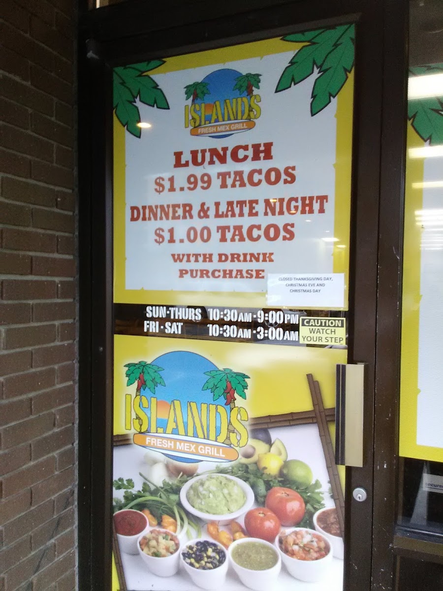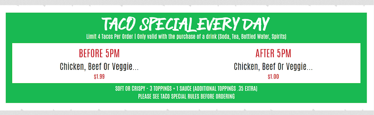 Chicken, Beef or Veggie | Offer only valid with the purchase of a drink (soda, tea, bottled water, spirits). Soft or crispy - 3 toppings + 1 sauce (additional toppings .35 extra). Please see taco special rules before ordering.